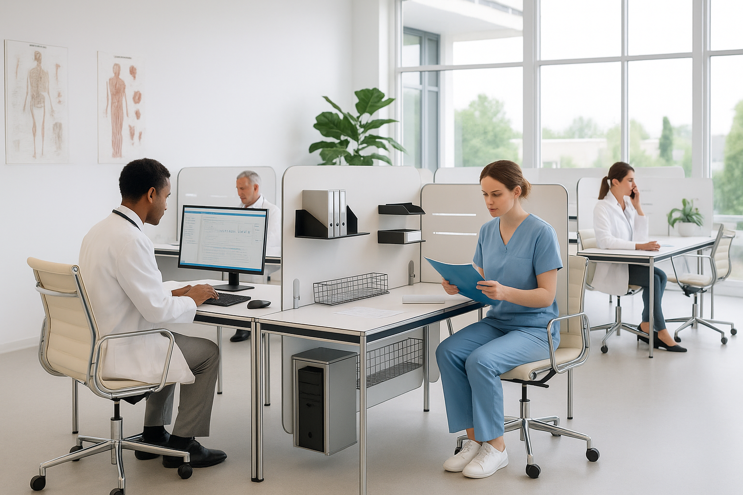 Im Gesundheitswesen zählt Klarheit, Hygiene und Struktur. Tidy-Wall ermöglicht saubere Trennung von Arbeitsbereichen, hygienisch unempfindliche Oberflächen aus HPL und optional akustische Paneele für mehr Ruhe. Medizinisches Zubehör, Dokumente und Technik finden ihren Platz in modularen Ablagen – schnell griffbereit und dennoch ordentlich verstaut. Perfekt für Empfang, Behandlungsräume oder Verwaltungsbüros in Praxen und Kliniken.